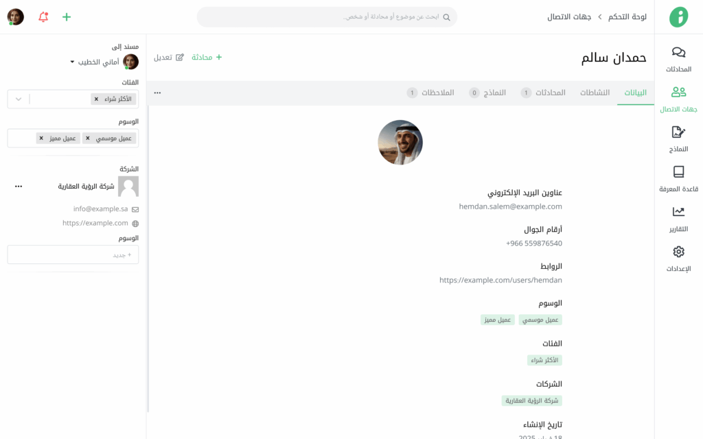 - بناء ملف تعريف غني: لا يقتصر الأمر على تخزين المعلومات المبدئية، بل يتيح لك نظام CRM إضافة ملاحظات من تواصلات العميل، تسجيل تفاصيل الاجتماعات، حفظ سجلات المحادثات عبر الدردشة أو البريد الإلكتروني، وتدوين التفضيلات.